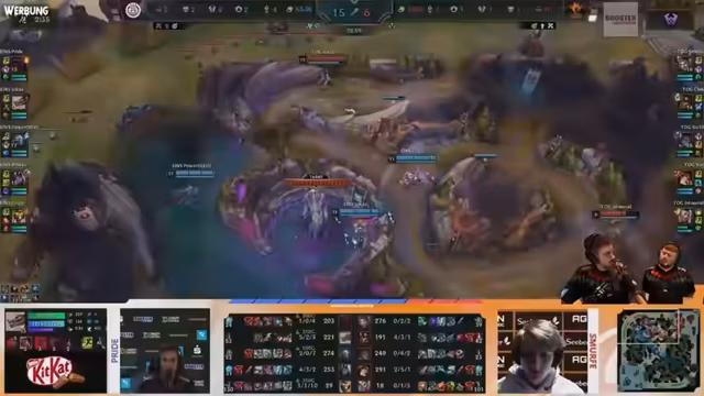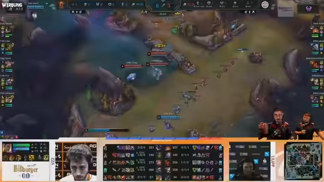 06:31:55Die Aufnahme beginnt mit intensiven Kampfszenen in einem Spiel, in dem der Kommentator verschiedene Aktionen wie Treffer, Blocks und Manöver beschreibt. Es folgt eine Phase der Diskussion über die anstehenden Spiele, in der die Team-Picks und Banns erörtert werden. Das Gegnerteam versucht, den Champion Bröki durch gezielte Banns auszuschalten, während das eigene Team entspannt mit Picks wie Jinx und Aurelion Sol antwortet, um ein Late-Game-Orientiertes Komposition aufzubauen.