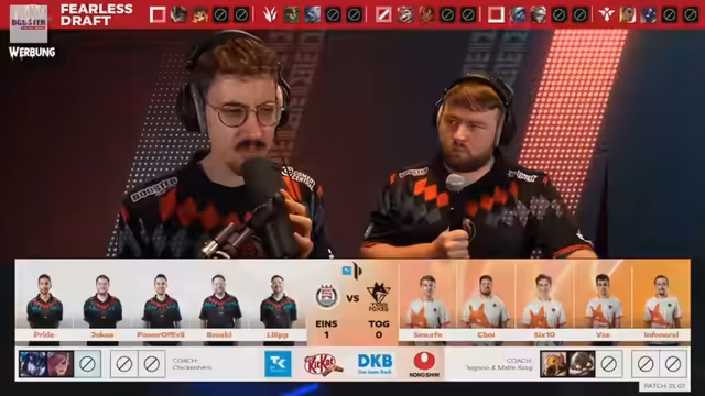 05:45:07Vor dem Start des zweiten Matches der Best-of-Serie wurde der neue Draft analysiert. Das Team wählte ein stärkeres Setup mit mehr Schaden, insbesondere über Varus. Gegnerische Bans wie Gwen wurden respektiert. Es wurde erwartet, dass das Team eine Reaktion auf die Niederlage des ersten Spiels zeigt und aggressiver agiert.
