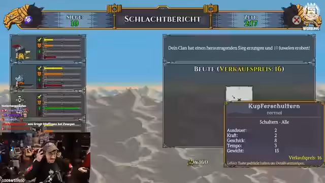 02:16:16Der Shop wird verbessert, um neue Wahrscheinlichkeiten zu erhalten. Der Fokus liegt auf der Rekrutierung von Zwergen, wobei Intelligenz für Damage Dealer (DD) als nicht notwendig erachtet wird. Es wird ein Zwerg rekrutiert, der nicht ganz so dumm und etwas schwerer ist. Das Schwert wird dem neuen Zwerg gegeben, da es besser als ein Speer ist. Es wird überlegt, die Hüllenschlacht zu starten. Der Streamer äußert seine Vorfreude auf das Late-Game und bedauert, noch nicht weit gekommen zu sein. Der Name des Zwergs wird diskutiert, wobei 'Bröki' als passender erachtet wird, da 'Tunni' nicht dumm genug ist. Der Kampf wird durch einen Schamanen verzögert. Nach einem Level-Up erhalten die Charaktere unterschiedliche Attributssteigerungen. Es werden Zwerge benötigt, die für DDs geeignete Ausrüstung tragen können, wie beispielsweise Kupferschultern, die Geschicklichkeit geben.