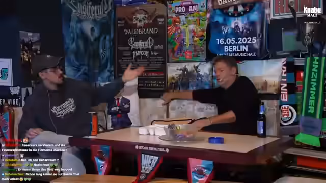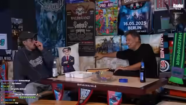 05:01:21Robert Habeck betritt die Bühne und wird von HandOfBlood begrüßt. Es wird Malzbier angeboten, wobei Habeck sein eigenes mitgebracht hat, das nach seinen Vorstellungen kreiert wurde. HandOfBlood erklärt Habeck, der sich als Twitch-Analphabet bezeichnet, die Grundlagen der Plattform, die im Wesentlichen Live-YouTube ist. Er betont die direkte Interaktion mit dem Publikum und die Bedeutung von Emotes im Chat. Habeck zeigt sich interessiert an der Plattform und stellt Fragen zum Chat und den Subscriptions. HandOfBlood erklärt die Bedeutung der lila Balken, die Subscriptions und erstmalige Chat-Nachrichten hervorheben. Er betont, dass er Habeck nicht journalistisch befragen wird, sondern es schätzt, dass dieser sich auf unbekanntes Terrain begibt.