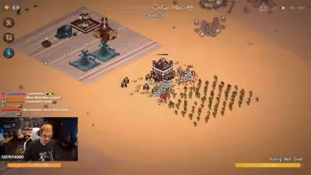 02:11:50Die Runde schreitet voran und der Fokus liegt auf dem Aufbau einer starken Verteidigung. Der Streamer nutzt verschiedene Upgrades, um seine Truppen und Türme zu verbessern. Er stellt fest, dass sein Flammenturm durch den Effekt des Schrein-Gebäudes extrem stark geworden ist und massive Schadenszahlen verursacht. Trotzdem entstehen neue Probleme, wie ein Goldmangel und das Auftauchen starker Gegner-Truppen. Das Spiel wird als "experimentell" und "Chaos" beschrieben, während der Streamer verzweifelt versucht, die Angriffe seiner Gegner abzuwehren.