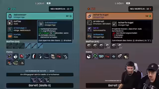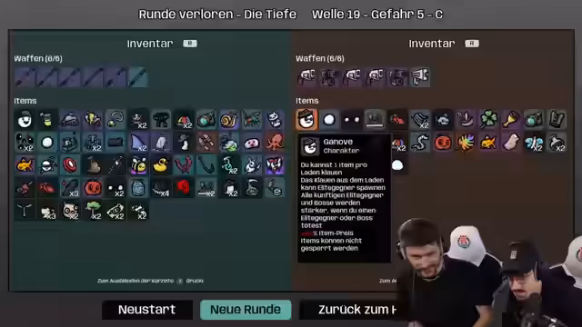 01:20:16Ein potenziell riskantes Item, das die Gegner-Leben in einer Welle stark erhöht, wird diskutiert. Die Spieler überlegen, ob sie es trotz der hohen Gefahr für Elite-Gegner versuchen sollen. Es wird eine Kooperationsstrategie entwickelt, bei der sich die Spieler in der Ecke verschanzen und gegnerische Aliens systematisch eliminieren. Der Fokus liegt darauf, Beute zu sichern und über die Runden zu kommen, wobei spezielle Items wie der Baum für Lebensraub eine wichtige Rolle spielen.