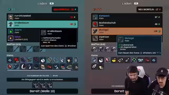 01:13:33Es wird über die Notwendigkeit diskutiert, sich zwischen Lebensabzug und Lebensregeneration zu entscheiden, wobei empfohlen wird, auf Tank zu gehen. Ein Spieler entscheidet sich für sechs Ausweichen, während der andere Schleudern in Betracht zieht. Der Pinguin wird als Item hervorgehoben, das HP-Regeneration bis zum Ende der Welle ermöglicht. Die kleinen, rutschenden Gegner werden als Stefans bezeichnet. Es werden verschiedene Items ausgewählt, darunter Tempo, Knochenwürfel und Anker. Ein Spieler kauft Revolver und Klaus die. Elitegegner im DLC werden als disgusting beschrieben. Es wird sich für die Bezeichnung Stricher für bestimmte Gegner entschieden. Ein Spieler schnappt dem anderen eine Frucht weg und erklärt, wie das Einsammeln von Früchten die Lebensregeneration erhöht. Die Zuschauer werden aufgefordert, Schere in die Kommentare zu schreiben, wenn sie bis zu diesem Punkt geschaut haben.
