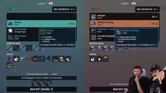 01:18:37In den frühen Runden des Spiels, ungefähr zur Welle 6, zeigt sich bereits hohe Aktivität. Es fällt eine rote Truhe an, was als sehr positiv bewertet wird. Eine Diskussion über die Effektivität des Amboss-Items entsteht, das eine Waffe zufällig verbessert und als insane angesehen wird. Gleichzeitig werden andere Items wie der Ring der Selbstjustiz und der dubiose Trank erwähnt, was auf eine aktive Phase des Item-Sammelns und -Bewertens hindeutet.