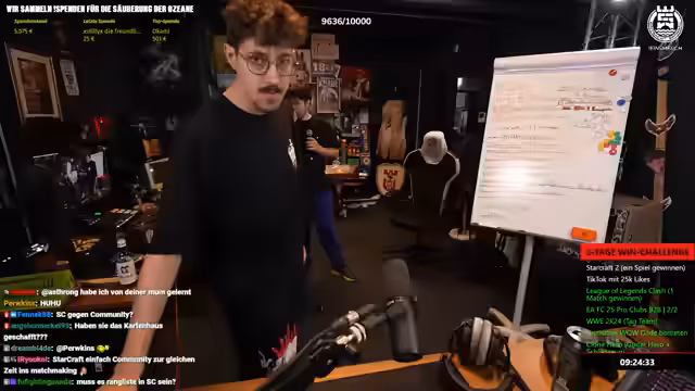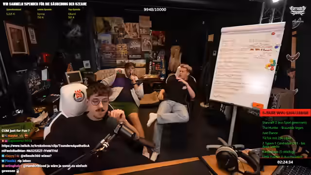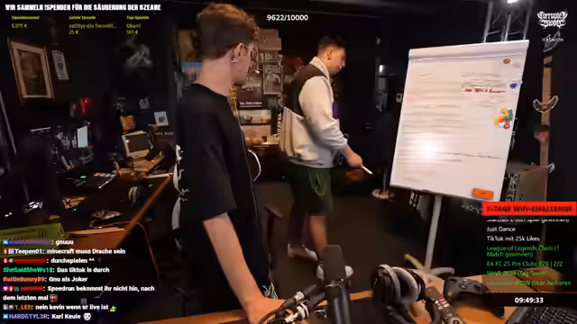 07:21:36Es wird kurz über Just Dance als mögliche Pause zwischen den anstrengenden Challenges gesprochen. Es soll ein Koop-Dance geschafft werden, ohne dass abgebrochen wird. Der Chat äußert Bedenken bezüglich Cheaten, was zu Diskussionen führt. Ein Fun Fact über die Verwendung von Dominosteinen beim Bau des ersten Quadrats des Kartenhauses wird geteilt. Eine kurze Pause zum Aufräumen, Essen und Kaffee wird angekündigt, um einen mentalen Reset zu ermöglichen. Es wird festgestellt, dass für Minecraft und StarCraft zusammen etwa 10 Stunden benötigt werden. Der Plan für Minecraft ist noch unklar, soll aber durch Chat-Abstimmungen mit möglichen Handicaps gestaltet werden. Für StarCraft muss ein Spiel gewonnen werden, egal wie.