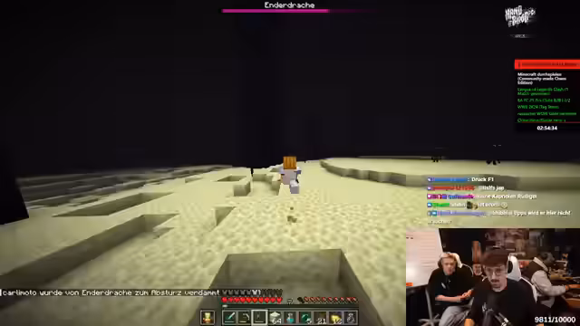 14:09:10Die Streamer lokalisieren die Türme und Kristalle im End und planen ihre Zerstörung. Es wird auf die Gefahr durch Endermen hingewiesen und die Notwendigkeit, Wasser bereitzuhalten, falls man von ihnen angegriffen wird. Kroko wird angewiesen, sich unter einen Kristall zu begeben, um ihn zu zerstören, und es wird besprochen, wie man die Kristalle auch aus der Distanz treffen kann. Einer der Streamer wird von einem Atemangriff des Drachen getroffen und muss sich zurückziehen, um sich zu heilen. Sie koordinieren ihre Positionen, um nicht zu nahe beieinander zu stehen. Die verbleibenden Kristalle werden lokalisiert und Strategien entwickelt, um sie zu zerstören, wobei die Schwierigkeit, durch den Kürbishelm zu sehen, thematisiert wird. Es wird besprochen, ob man sich hochbauen soll, um eine bessere Übersicht zu bekommen, aber davon wird abgeraten, da man sonst nicht mehr vom anderen gehauen werden kann.