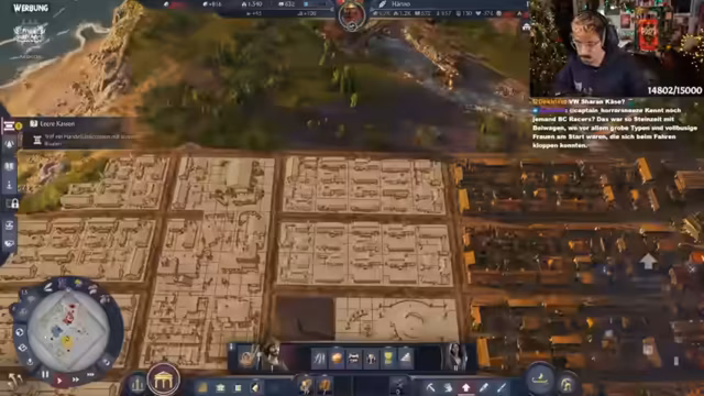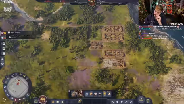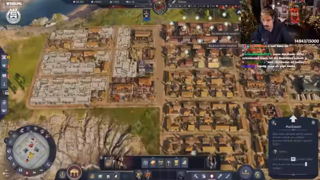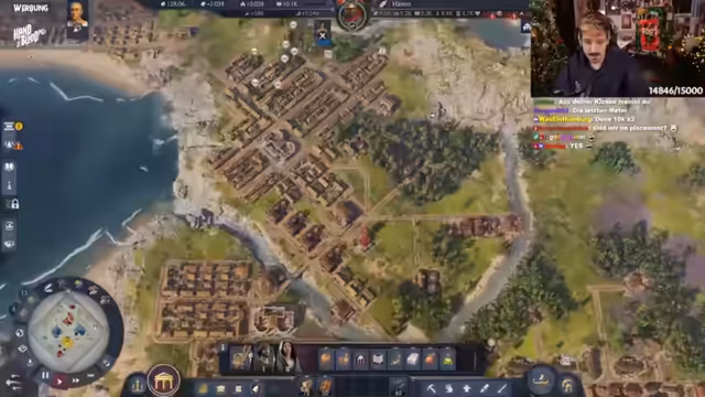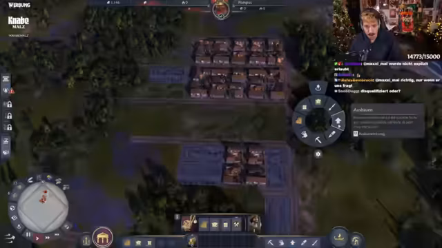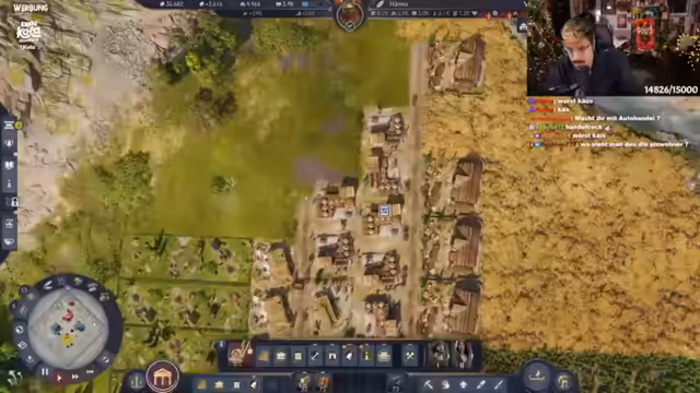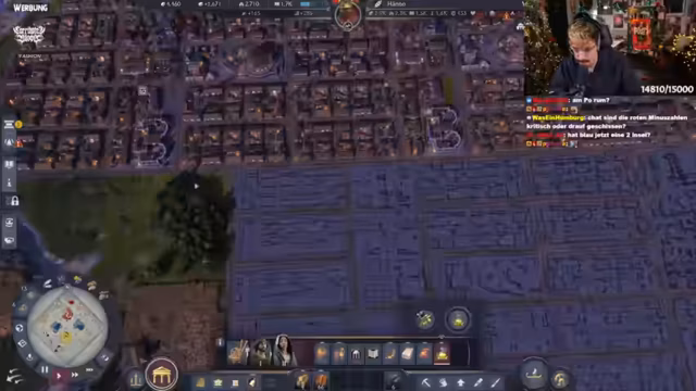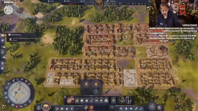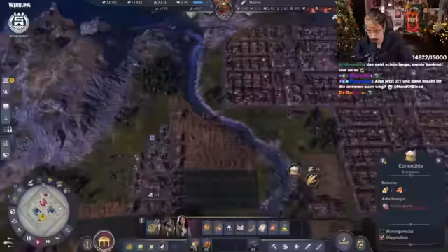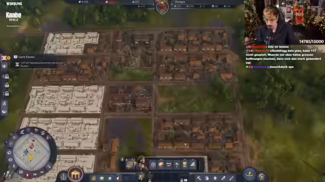05:26:46Der Streamer plant strategisch den weiteren Aufbau in Anno 1800. Fokus liegt auf Spinnereien und Lagerhaltung, da diese erst ab der nächsten Stufe verfügbar sind. Es wird diskutiert, die Villa auf Ansehen statt Wissen zu setzen, und moderne Bauweisen der Liberty-Tunikenhersteller diskutiert. Aktuell werden 800 Einwohner gezählt, mit langsam steigenden Zahlen. Grammatikus und Spinnereien werden als prioritäte Bauprojekte festgelegt. Technische Schwierigkeiten mit der Steuerung führen zu Frust, dennoch wird versucht, den Chat für koordinierte Aktionen zu nutzen.