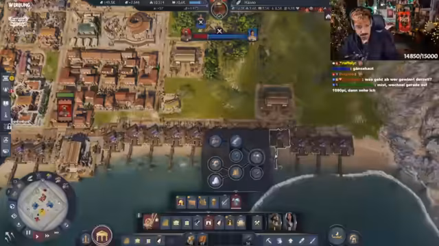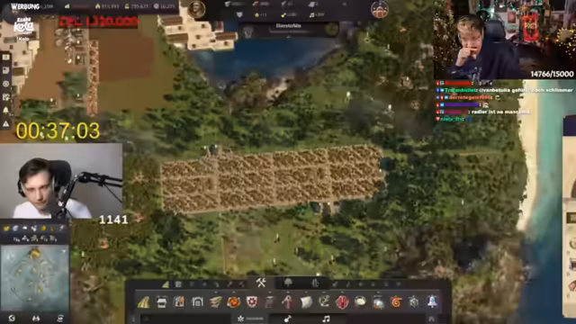 05:29:39Wichtiges Item-Holen ist durch ein Embargo unmöglich, ausgelöst durch Krieg mit dem Kaiser. Es herrscht Unsicherheit, ob Haus-Upgrades mehr Wissen oder Bevölkerung bringen – letztlich wird Bevölkerung priorisiert. Der Streamer rechnet mit Erreichen von 10.000 Einwohnern durch Upgrades und plant, Inseln durch Händler mit Endprodukten zu versorgen. Finanziell sieht es gut aus (9.400 Wissen), doch der Ausbau weiterer Inseln bereitet Kopfzerbrechen. Ein emotionaler Crash-Out wegen Spielmechaniken folgt, bevor der Fokus auf das Halten von 10.000 Wissen und Bevölkerung für 10 Minuten gelegt wird.