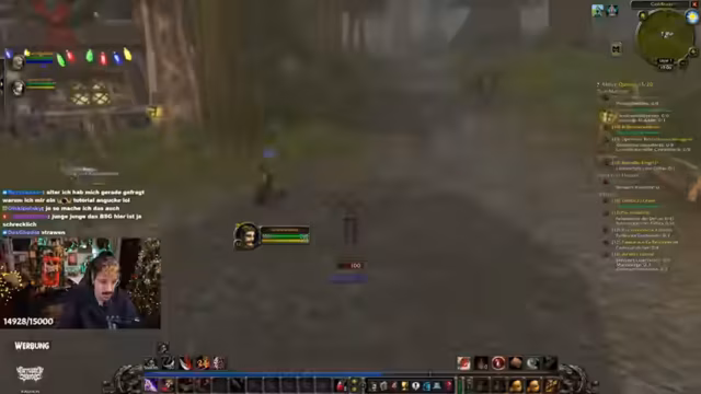 06:29:33Sarah präsentiert ihre Quests (rotes Leinenkopftuch, Jaspermine, Rolfs Schicksal). Der Streamer erklärt Quest-Icons auf der Minimap, Hover-Tooltips für Belohnungen und die Bedeutung von Quest-Farben (gelb = passendes Level). Er rät, Quests mit niedrigeren Leveln zuerst abzuschließen, um Erfahrung zu sammeln, bevor riskantere Ziele angegangen werden.
