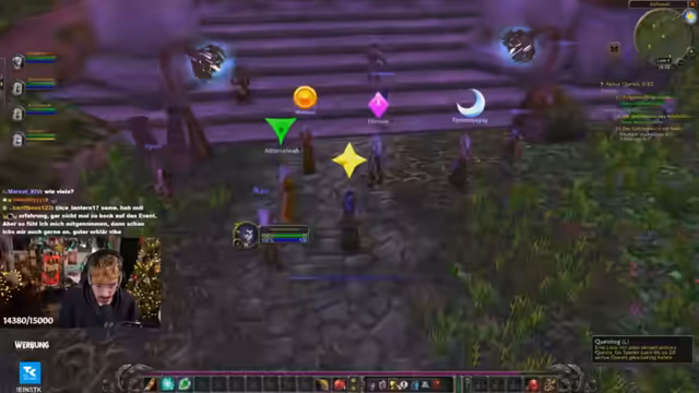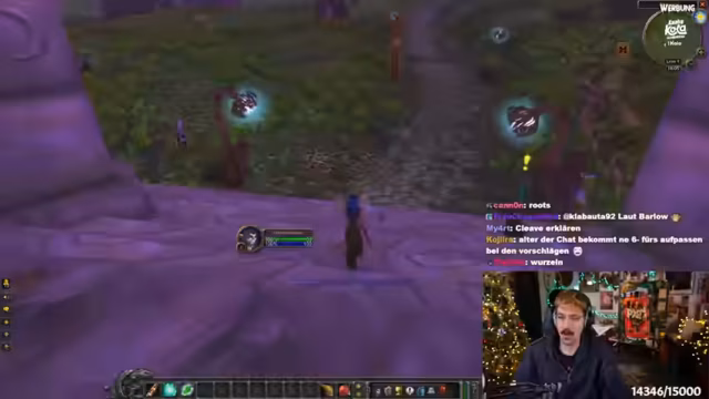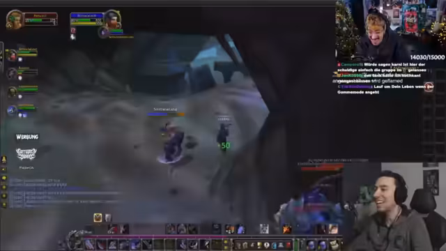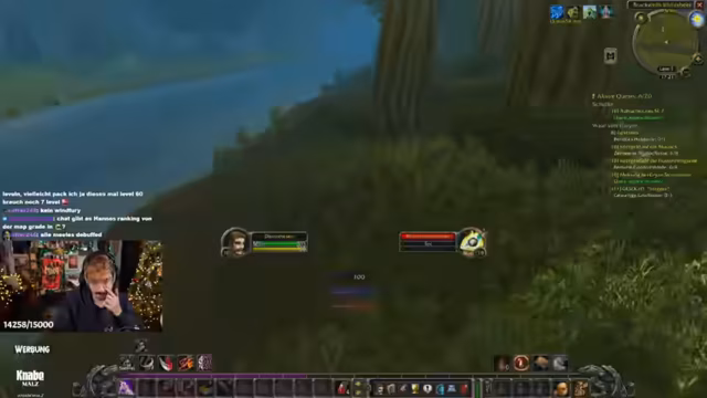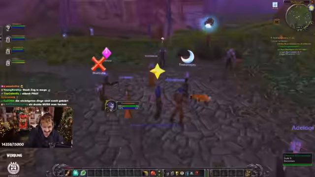 06:31:24Nach Abschluss der Teufelsmoos-Quest bittet der Streamer die Gruppe um eine kurze Toilettenpause. Dabei erklärt er die Sicherheitsmaßnahmen: Spieler sollten sich in Städten oder nahe einem Gasthaus ausloggen, um den 20-Sekunden-Warp zu umgehen. Der Fokus verlagert sich auf die Ankündigung eines bevorstehenden World of Warcraft Hardcore Events, das am 27.12. starten wird. Streamer und Zuschauer tauschen sich über das Event und ihre Teilnahme aus. Auch das Nutzen der 'Geselligkeit'-Liste (Hotkey O) wird empfohlen, um Gruppenmitglieder als Battle.net-Freunde hinzuzufügen.