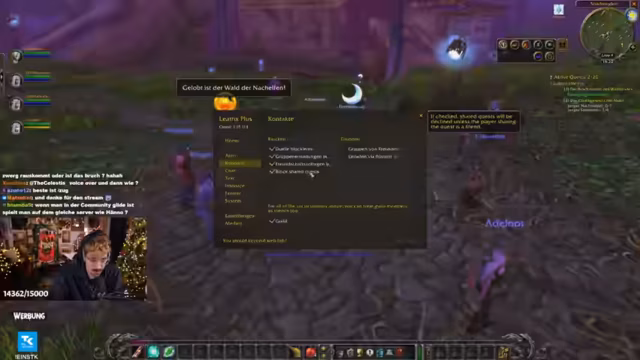 06:36:22Der Stream beginnt mit technischen Herausforderungen bei der Freundesanfrage in World of Warcraft. Der Streamer muss einstellen, dass Charaktere statt Accounts als Freunde hinzugefügt werden, um die Gruppenquest zu starten. Die Gruppe beschließt, zunächst alle im Dorf verfügbaren Quests anzunehmen und effizient zu erledigen. Dies führt sie zu den ersten Questzielen, wie dem Töten von Distel-Ebern. Die Kommunikation läuft über den Gruppen-Chat, und es werden grundlegende Spielmechaniken wie das Nutzen von Tab zum Anvisieren von Gegnern erklärt.