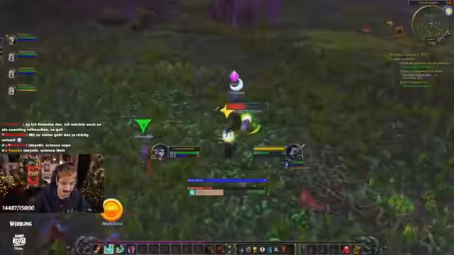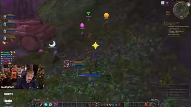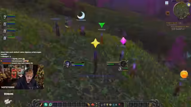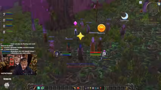 05:46:36Die Gruppe startet die Quest 'Beschütze den Wald vor Teufelsmoos', bei der das gleichnamige Moos gesammelt werden muss. Da das Moos nicht direkt gepflückt werden kann, müssen spezielle Monster, die Grellkins, getötet werden. Die Grellkins sind höherstufig und aggressiv, was eine koordinierte Taktik erfordert. Ein Spieler muss den Kampf eröffnen, während die anderen folgen. Der Streamer warnt vor dem Fehler, mit dem Heiler sofort in den Kampf einzugreifen, da die Aggro schnell auf den Healer wechselt. Die Zielsetzung ist es, alle acht Teufelsmoos-Teile gemeinsam zu farmen.