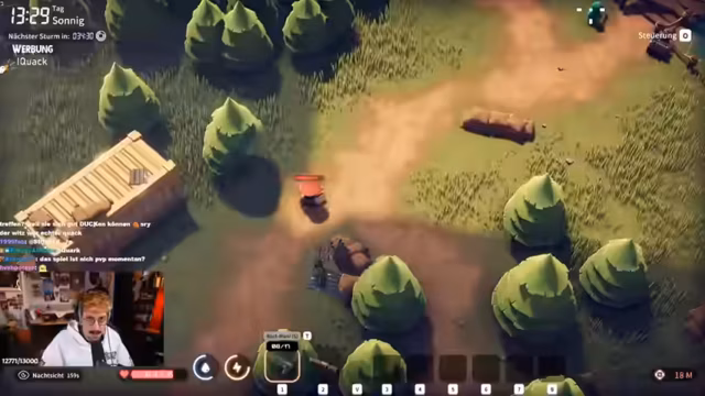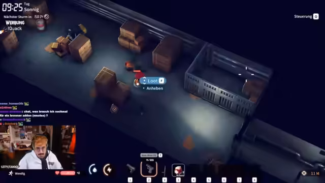 01:51:40Der Streamer ist von der Menge und der Geschwindigkeit des Chats überfordert und bittet um weniger Backseat Gaming. Er konzentriert sich auf das Gameplay, entdeckt ein Markierungssystem für wichtige Items und beginnt, die Funktionen des Lagers zu verstehen, wie z.B. die Forschung von Bauplänen. Er findet eine Spendenkiste am Eingang, die durch weitere finanzielle Beiträge aufgerüstet werden kann. Die Dynamik des Spiels, wie prozedural generierter Loot und Gegner, wird weiterhin erläutert.