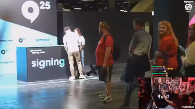 04:33:47Die Reise durch die Gamescom Hallen beginnt mit einem instinktiven Ziel: Autogrammstunden und Meet & Greets zu organisieren. Die Protagonisten identifizieren eine Schlange bei Zabex, einem Newcomer des Vorjahres, und wollen die Gelegenheit nutzen. Parallel taucht ein weiteres Ziel auf: Bröki. Eine Anekdote über eine plötzliche Begegnung und eine persönliche, humorvolle Aktion, bei der Bröki einen Knopf ins Ohr bekommt und eine Geheimhaltung vereinbart wird, sorgt für Aufsehen und ist das eigentliche Ziel der Mission.