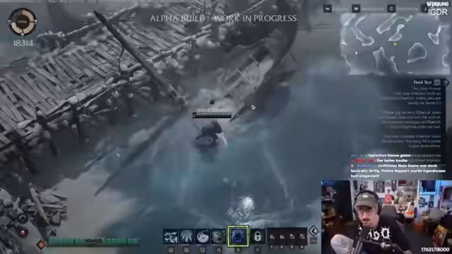 00:45:44Die ersten Minuten im Spiel zeigen ein Tutorial mit einem Timer, um das Spiel kennenzulernen. Der Streamer steuert seinen Charakter mit WASD und sammelt anfangs grundlegende Ausrüstung wie einen Schild, einen Beutel und einen Regenerationstrank. Die Mechaniken der Heilung, bei der zunächst nur der gelockte Teil der Lebenspunkte regeneriert werden können, werden erklärt. Das erste Level-Up und die Fähigkeitspunkte werden erhalten, um den Charakter anzupassen. Der Fokus liegt zunächst auf dem Überleben und dem Verständnis der grundlegenden Spielmechaniken.