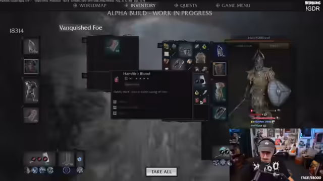 01:07:30Nach dem Tutorial beginnt der eigentliche Kampf. Der Streamer experimentiert mit verschiedenen Fähigkeiten, die von den ausgerüsteten Waffen abhängen. Er entscheidet sich für einen Schildwurf, der Gegner an der Landung hindert, und eine Fähigkeit, die bei niedrigen Lebenspunkten Heilung über Zeit gewährt. Der Drang, alles mögliche Loot aufzusammeln, da dieser bei einem Tod verloren geht, wird als zentrales Gameplay-Element hervorgehoben. Das Inventarmanagement wird schnell zu einer Herausforderung, da die Kapazität begrenzt ist und man Gegenstände wie Rezepte abwerfen muss, um Platz für Beute zu schaffen.