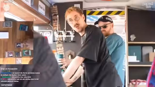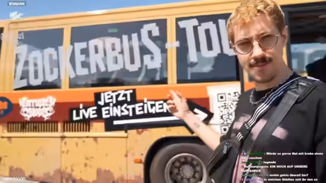 00:01:49Der Live-Stream beginnt mit technischen Problemen, die jedoch schnell behoben werden. Michael Popka und Kallokosch begrüßen das Publikum und starten mit ihrer "GROßEN ZOCKERBUS TOUR". Sie präsentieren ihren polierten Bus, der mit QR-Codes versehen ist, um neue Zuschauer anzuziehen. Die Route führt sie durch Deutschland bis hin zu Rock am Ring, wo sie das Festival besuchen werden.