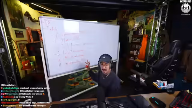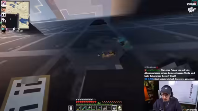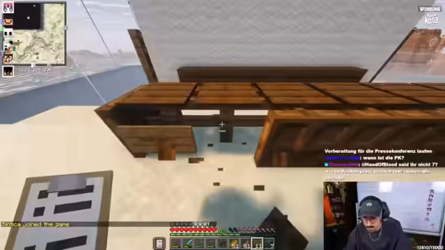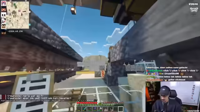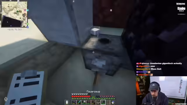 08:53:23Ein kritischer ereignisreicher Moment im Stream ist der Ausbruch eines Brandes in der Minecraft-Farm. Lava, die fälschlicherweise mit Wolle in Berührung kam, setzt das gesamte Gebäude in Brand. Es herrscht panische Aktivität, da der Streamer und sein Team versuchen, das Feuer mit Wasser-Eimern zu löschen und den Schaden einzudämmen. Der Zwischenfall führt zu massiven Ressourcenverlusten, insbesondere an Wolle, und verdeutlicht die Risiken des Bauprozesses.