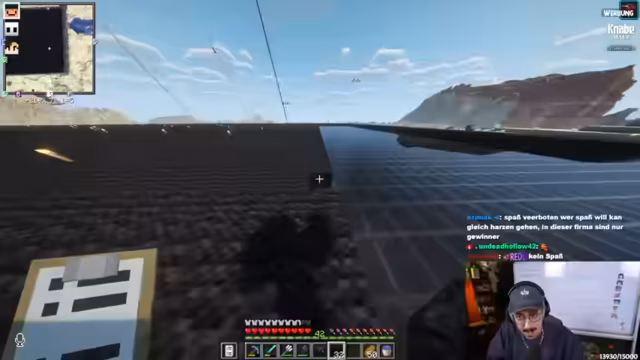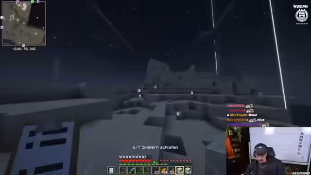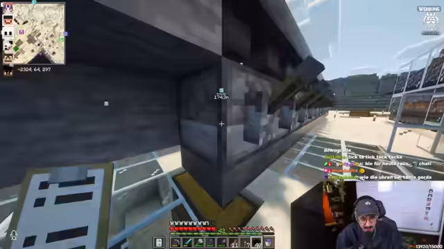 01:45:08Der Fokus verschiebt sich auf das Minecraft-Projekt 'das Loch'. Nach einem unvorhergesehenen Blitzschlag, der glücklicherweise nur Glas zerstörte und so die Ernsthaftigkeit der Situation aufzeigte, wurde mit dem Bau von Blitzableitern begonnen. Der Bau der Wände aus schwarzer Wolle und des Bodens aus Glas und Froglight schreitet voran, wobei eine zusätzliche Glasschicht für Lichtspiegelungen geplant ist. Die Ressourcenversorgung, insbesondere die Tintenfischfarm, stellt eine Herausforderung dar, die durch manuellen Abbau gelöst werden kann.