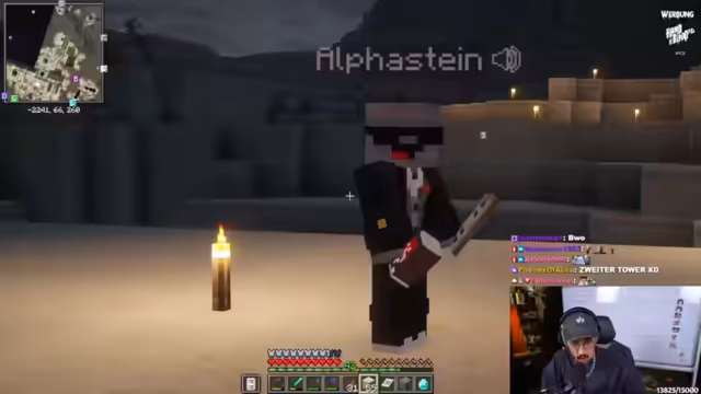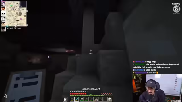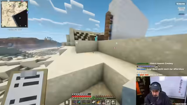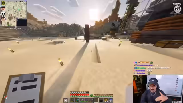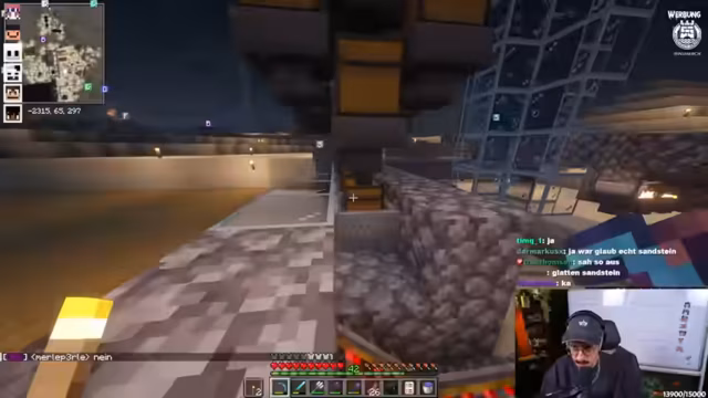 09:12:38Es findet ein Vergleich der Projektumfänge statt, wobei der Streamer betont, dass sein Team einen deutlich höheren Schwierigkeitsgrad und mehr Biomasse hat als andere Gruppen. Man entscheidet sich, das bisherige Vorgehen beim Sandabbau zu ändern und stattdessen einen Enderperlen-Chunkloader zu bauen, da dies effizienter ist. Die Entdeckung einer fehlerhaften Wollefarm führt zu einer investigativen Aufklärung.