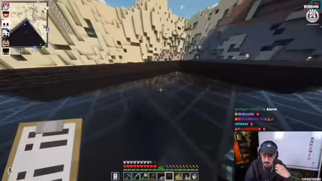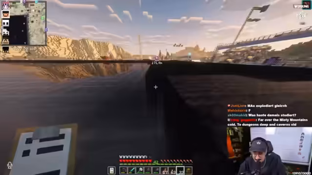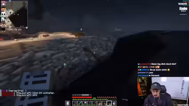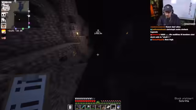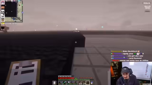09:02:21Die Arbeiten am Dach des Infinity Castles gestalten sich als äußerst frustrierend und eintönig. Der Streamer ist wütend, da er es hasst, die Nadel im Heuhaufen zu suchen, und ständig auf versteckte Lavaquellen stößt, die die Wände in Brand setzen. Nach anfänglichem Chaos, in dem die genaue Position eines Loches unklar ist, werden Koordinaten gesammelt, um die Lavaquelle zu lokalisieren und zu beseitigen, was schließlich als satisfying gelingt.