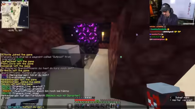09:56:12Die Verwirrung um die Portalsituation eskaliert, da Spieler zwischen zwei verknüpften Portalen in eine Endlosschleife geraten. Der Streamer analysiert das Problem, bei dem ein Portal in der Oberwelt zu einem falschen Chunklader im Nether führt, und schlägt eine einfache Lösung vor: ein Schild zur Kennzeichnung und die bevorstehente Entfernung der fehlerhaften Anlage, sobald das Material nicht mehr benötigt wird.