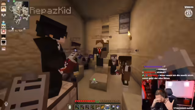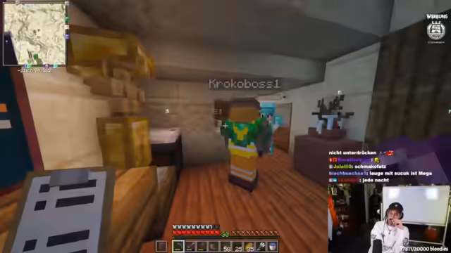 02:50:13Der Versuch, einen Ghast an einem Zaun anzuleinen, scheitert wiederholt, was zu Frustration führt. Die Text-to-Speech-Nachrichten im Chat werden als störend empfunden, und der Streamer äußert, dass er diese manchmal ausblendet. Eine Text-to-Speech-Nachricht, die sich auf ein persönliches Erlebnis bezieht, wird eingespielt, woraufhin der Streamer humorvoll reagiert. Er versucht, seine Ressourcen zu organisieren und unnötige Gegenstände in eine 'Mülltruhe' zu legen. Es wird festgestellt, dass Eichenholz kaum verwendet wird, während Fichtenholz in großen Mengen vorhanden ist. Der Streamer plant ein Teambuilding-Event und eine Rollenspiel-Session, äußert jedoch seine Abneigung gegen Among Us, das ebenfalls auf dem Plan steht.
