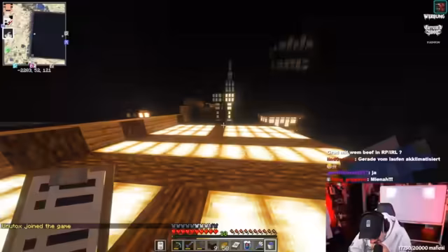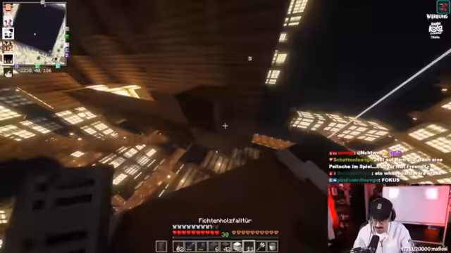 08:21:09Der Streamer beklagt sich über beginnende Erkältungssymptome, während er im Spiel über das Entfernen von Gegenständen auf seiner Plattform spricht, insbesondere über Froglights, die möglicherweise von Jedi platziert wurden und das Spawnen von Kreaturen begünstigen könnten. Es wird auch über die Menge an schwarzem Glas diskutiert, die für den Bau eines Turmbodens benötigt wird, wobei die Beschaffung von schwarzer Farbe als Herausforderung identifiziert wird. Ein weiterer Spieler namens Longa wird gefragt, was er am Turm des Streamers macht. Es wird auch kurz über Among Us gesprochen, wobei der Streamer seine Abneigung gegen das Spiel äußert, besonders wenn er nicht der Imposter ist. Er bittet um schwarze Tinte oder schwarzes Glas, um sein Bauprojekt fortzusetzen und vergleicht die Ästhetik von schwarzem und normalem Glas.