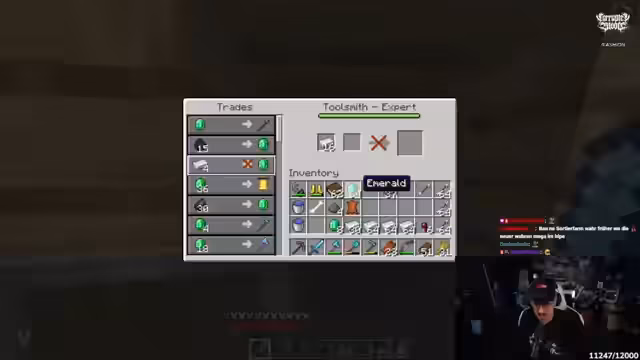 04:09:15Der Streamer präsentiert eine erweiterte Trading Hall, in der er multiple Schmiede und andere Berufsbewohner platziert hat. Er erläutert eine spezifische Handelsstrategie: Schmiede auf Level 2 bieten vier Eisenbarren für Smaragde an, was es ihm ermöglicht, fast einen ganzen Stack Eisen zu handeln und so quasi 'Geld zu drucken'. Er nutzt auch andere Berufsbewohner wie Kartografen und Fletcher für verschiedene Handelsmöglichkeiten.