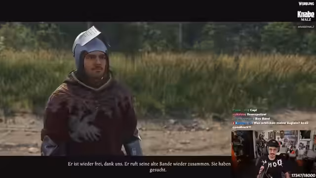 04:46:03Nach einer Unterbrechung wird das Rollenspiel „Kingdom Come: Deliverance“ wieder aufgegriffen. Die aktuelle Position der Figur in der Stadt Kuttenberg wird festgestellt, und es wird der aktuelle Questfortschritt besprochen, insbesondere die Suche nach verschollenen Mitgliedern der Bande des Knochenteufels. Der Streamer interagiert mit den Bewohnern, führt quests durch und versucht, Informationen über den Verbleib von Charakteren wie Bula und Ranjek zu erhalten.
