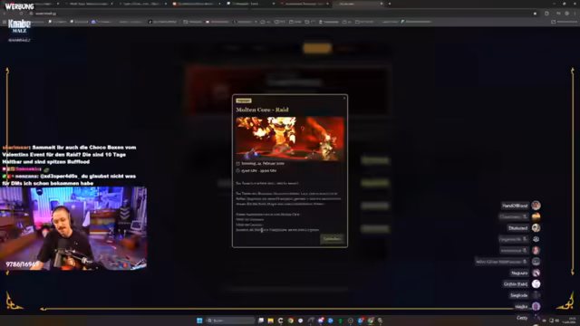 02:49:19Nachdem der Streamer die Dokumentation über die Waschanlage als sehr gelungen und informativ bezeichnet, geht er zum eigentlichen Kern seines Kanals über: dem World of Warcraft. Er kündigt ein wichtiges Gilden-Meeting für den kommenden Sonntag an, bei dem der Raid-Kader für ein anstehendes Event bekannt gegeben werden soll, was die Stimmung im Chat deutlich anheizt.