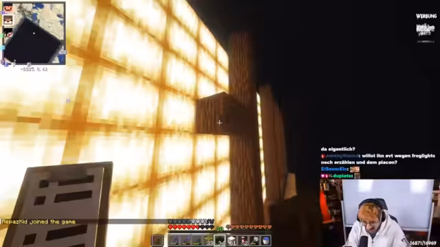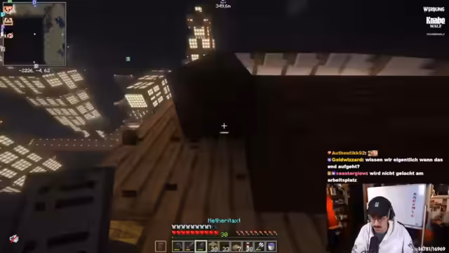 09:03:25Eli befindet sich in einer Diskussion mit anderen Craftern über den Bau eines Netherite Beacons, einem extrem aufwendigen Projekt, das 11.000 Ancient Debris erfordert. Der Streamer lehnt eine Beteiligung ab, da er es als zu gierig und unnötig empfindet und vermutet, dass Eli sich von seinem Chat manipulieren lässt. Es wird betont, dass das Infinity Castle als Hauptprojekt fertiggestellt werden soll und weitere, überzogene Herausforderungen nicht notwendig sind, insbesondere angesichts eines bereits vollen Jahres mit Events und Game-Releases. Die mathematische Berechnung für vier Etagen eines Netherite Beacons würde 6624 antiken Schrott erfordern, was die Dimension des Vorhabens verdeutlicht.