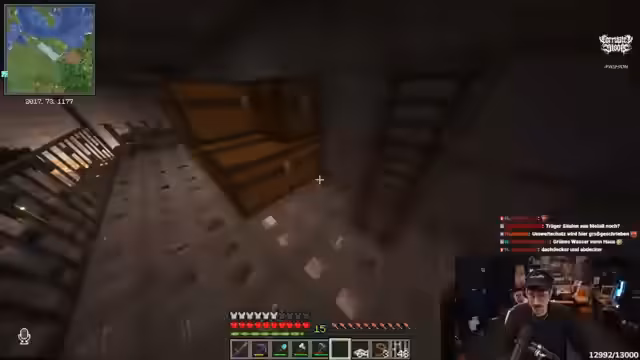 05:27:34Es wird über Hygienebestimmungen gesprochen, während Kupfersachen ausgebreitet werden, um den Unterschied zwischen volloxidiertem und sauberem Kupfer zu zeigen. Es wird erklärt, wie man die Zwischenstufe der Oxidation mit einer Axt abschrubben kann, um das Kupfer wieder sauber zu bekommen. Der Streamer erwähnt, dass er sich theoretisch jemanden vom Jobcenter holen könnte, um das Dach freizukratzen. Es wird festgestellt, dass sich jemand unbefugt bedient, was erklärt, warum nie Brathähnchen vorhanden sind. Es wird die Idee geäußert, jede Truhe mit Minecarts mit TNT zu versehen, um unbefugte Nutzer in die Luft zu jagen. Ein kurzer Clip wird angesehen, der den Streamer am Ende zeigt. Die Trichter sind voll, weil sie immer zuerst nach unten und dann zur Seite fallen. Es wird erwähnt, dass man Tiere benennen kann, damit sie auf dem Kopf hängen. Kevin wird als dumme Sau bezeichnet, weil er sich bedient hat. Der Boden ist jetzt verdichtet, falls Papa Platte wiederkommt. Es wird überlegt, ob man die Fliesen durch Polish Deep Slate Blöcke ersetzen soll, um mehr aus einem Block herauszuholen.
