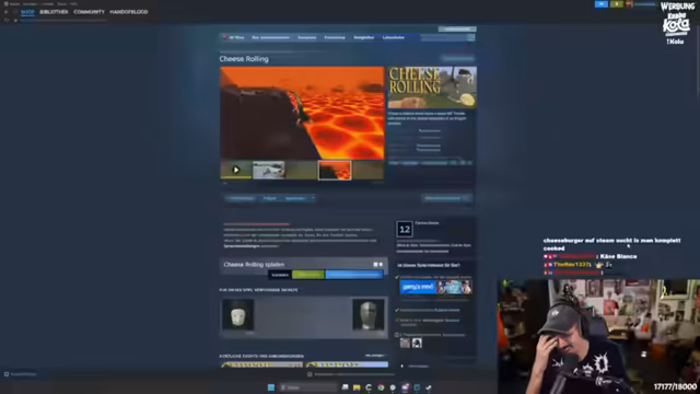 03:18:31Aufgrund des vorgeschlagenen Spiels 'Käse jagen' wird eine spontane Runde gestartet. Nach einigen Startschwierigkeiten bei der Lobby-Erstellung und Einladung der anderen Teilnehmer, beginnt man das Spiel. Das Ziel ist es, als Erster einen einen Berg hinabrollenden Käse zu fangen oder als Erster unten anzukommen.