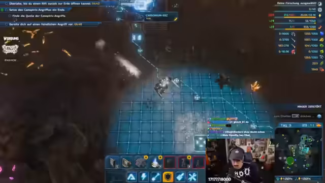 03:51:43Nachdem endlich alle in 'Riftbreaker' im Spiel sind, beginnt die erste Erkundungsphase. Der Streamer erkundet die Steuerungselemente, wie Bewegung, Dash und das Auswechseln von Waffen. Er identifiziert die Ressourcen, die abgebaut werden müssen, und beginnt mit dem Bau des Hauptquartiers, um eine Basis zu errichten und sich auf die Verteidigung gegen anstehende Wellen vorzubereiten.