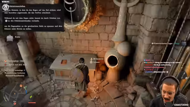 01:31:21Während der Erkundung stößt der Streamer auf verschiedene Nebenquests. Eine besonders erwähnenswerte Quest ist die Suche nach einer verschwundenen Katze, die den Spieler durch eine Kanalisation führt. Neben der Katersuche werden auch andere kleine Missionen wie das Reinigen eines Kamins absolviert. Dabei werden die im Tutorial erlernten Mechaniken wie das Werkzeug-Slot-System und die Interaktion mit Objekten angewendet, wobei die Steuerung teilweise als umständlich kritisiert wird.