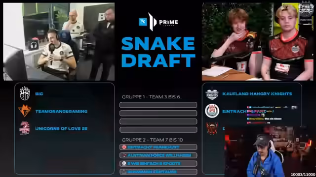 04:20:43Es wird über Internetprobleme und die Draft-Phase der Prime League gesprochen. Die Teams verteilen Punkte an andere Teams, um ihre Stärke einzuschätzen. Eintracht Spandau erhält von Unicorns of Love acht Punkte für den dritten Platz, begründet mit der Stärke von Schipi. Der zweite Platz geht an Big, aufgrund ihrer großen Brieftasche und den großen Namen. Kaufland wird als Nummer eins genannt, da sie die besten Spieler haben. Die Streamer-Teams streamen ihre Scrims, was als dumm angesehen wird. Es wird erwähnt, dass Dung Dynasty auf den vierten Platz geratet wurde, obwohl sie eigentlich schlecht sind. Es wird über die Gruppenverteilung diskutiert und dass die Zentauren Eintracht Spandau am niedrigsten gerankt haben. Es wird spekuliert, ob es besser ist, hoch gerankt zu werden, obwohl man schlecht ist. Eintracht wird auf Platz eins gesetzt, was den Community-Aspekt widerspiegelt. Es gibt zwei Gruppen in der Prime League. Big darf als erstes Team wählen, gegen wen sie spielen wollen und wählen Team Orange Gaming. Eintracht Spandau wird von DonArts gewählt, was für Aufregung sorgt. Die anderen Teams werden ebenfalls den Gruppen zugeteilt.