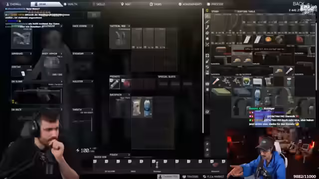 01:37:32Der Streamer bietet an, Maximilian in die Welt von Escape from Tarkov einzuführen und ihm die Grundlagen zu erklären. Er bittet Puzzle, sich nicht in die Erklärung einzumischen. Der Streamer schickt eine Anfrage für den Stream und bittet Stelzig, seinem Discord-Stream beizutreten, wobei er darauf hinweist, dass sie sich im Stream-Raum und nicht in der Lobby befinden müssen, um Verwirrung zu vermeiden. Sie diskutieren kurz über die Möglichkeit eines Delays, wenn Stelzig den Stream auf einem anderen PC öffnet. Der Streamer erklärt Maximilian die Filteroptionen im Stash, insbesondere die Autosortierfunktion, die thematisch nach Munition, Magazinen, Medikamenten und Waffen sortiert. Er fragt Maximilian, wie er sich auf einen Raid vorbereitet, insbesondere in Bezug auf Munition und Ausrüstung. Sie besprechen die Auswahl der richtigen Munition und die Priorisierung der Ausrüstung vor der Munition. Der Streamer empfiehlt eine Weste und ein Headset, auch wenn es sich um die schlechtesten im Spiel handelt.