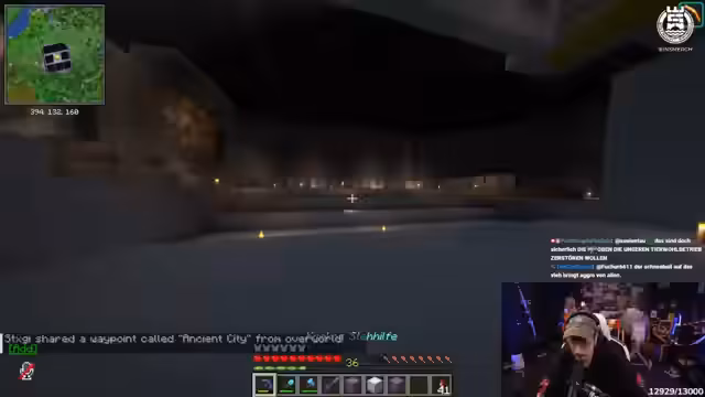 06:34:11Kevin baut Erebor. Es wird ein Stadion entdeckt und nach einem Eingang gesucht. Eine Mine wird gefunden, aber nicht genutzt, da sie nicht die richtige Höhe hat. Stattdessen wird ein Weg nach unten gegraben, wo sich Sculks befinden. Die Frage wird aufgeworfen, ob das Fliegen als Vibration gilt und ob es die Warden anlockt. Es werden Sculks abgebaut, wobei darauf geachtet wird, keinen Shrieker auszulösen, um keinen Warden zu beschwören. Nach dem Abbau von vier Sculks wird ein Portal gefunden und der Plan gefasst, Tamina zu besuchen.