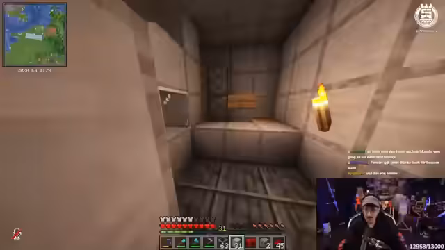 06:56:16Der Streamer beginnt mit dem Bau einer geheimen Todesfalle für andere Spieler. Er braucht dafür eine Ender-Chest und sucht nach einem Hebel, der unauffällig platziert werden kann. Die Konstruktion erweist sich als komplex, da er das Signal unauffällig weiterleiten muss und gleichzeitig verhindern will, dass der Hebel gefunden wird. Er erhält Ratschläge vom Chat und experimentiert mit verschiedenen Redstone-Komponenten.