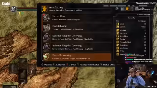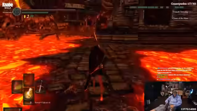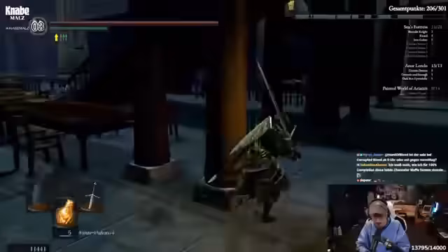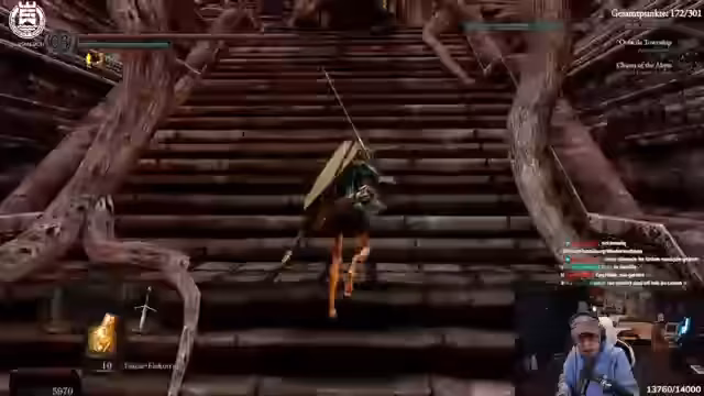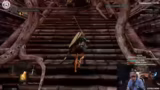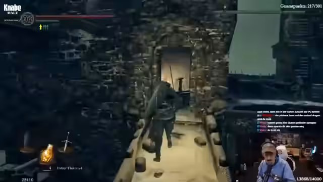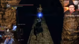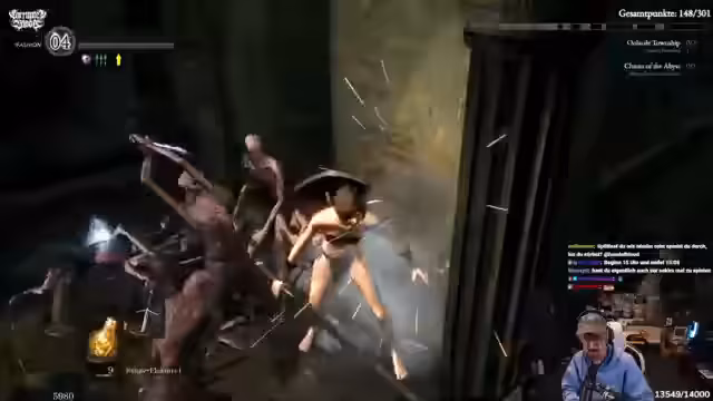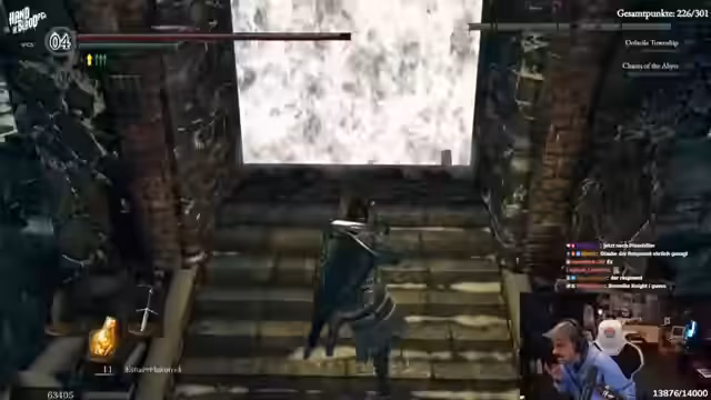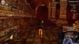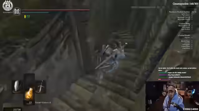 04:38:08Die Route führt nun in die Tiefe. Der Grabdämon wird bekämpft, dessen Bruch die Machete droppen kann. Danach geht es weiter zum Fahrstuhl, um die Chaoshexe zu erreichen. Das Gebiet als Ganzes wird als chaotisch und anstrengend empfunden. Der Streamer muss sich ständig orientieren, vergisst oft, wo der Bonfire liegt, und wird von der Community bei der Orientierung schlecht unterstützt.