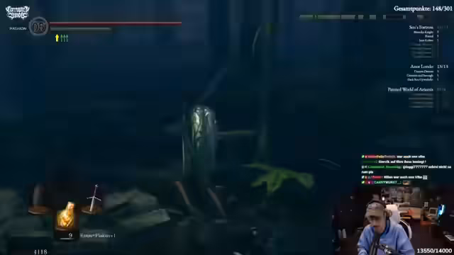 04:25:37In der Sen's Festung wird eine Schlange überrollt, was erstaunlich viele Seelen einbringt. Es wird ein Zauberlehrer mit Kugel freigeschaltet und eine große Seele gesammelt. Der Streamer will nicht weiter durch die Festung laufen und kehrt stattdessen zum Firelink-Schrein zurück, um seine Zaubersprüche zu holen. Er lässt die Festung erstmal stehen, um andere Punkte auf der Karte zu besuchen und seine Attribute zu stärken.