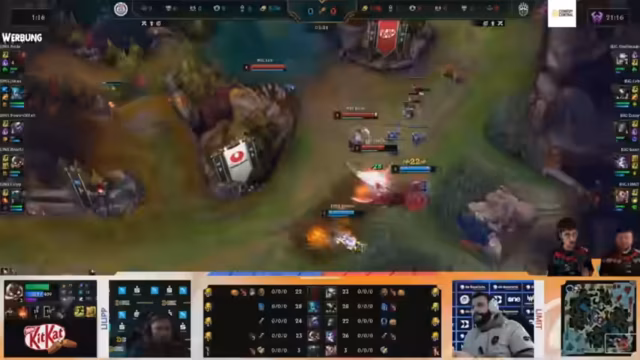 02:52:07Das Spiel beginnt mit einem frühen Invade des gegnerischen Teams 'Big', der jedoch schnell bestraft wird. Das eigene Team erhält daraufhin wichtige Informationen über den Standort des gegnerischen Junglers. Ein Gnar-Spieler zeigt starke mechanische Fähigkeiten und sichert sich einen Kill. Es wird über dieitemisierte Fähigkeit 'Demolish' diskutiert, deren Nutzen in der Anfangsphase möglicherweise angepasst wurde. Das Spiel verläuft dabei auf mehreren Lanes aktiv und komplex.