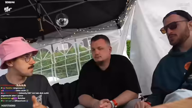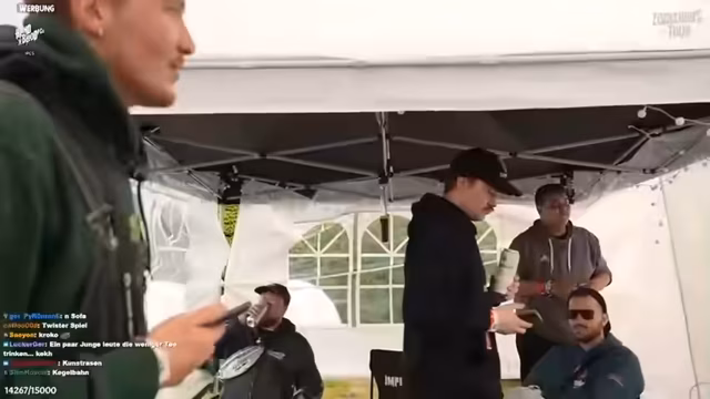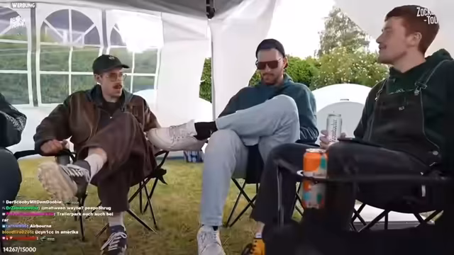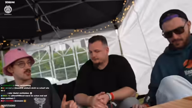 06:21:59Zum Ende des Stream-Ausschnitts versuchen die Streamer, einen Autoreifen, den sie als "Totakorn" bezeichnen, zu handeln. Sie bieten ihn gegen diverse Gegenstände an, darunter Schokobons und eine 3-Mann-Schleuder, deren Wert sie infrage stellen. Trotz eines kurzen Versuchs, mit dem Reifen zu spielen, bleibt das Interesse der anderen Festivalbesucher gering. Der Stream endet damit, dass das Team mit den erhandelten Gütern und einem ungelösten Deal über den Reifen weiterzieht.