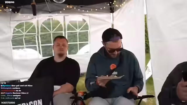 09:03:39Beim Essen und Trinken herrscht ein leichtes Chaos, da Teller Mangelware sind und der Verbleib des Bautzener Senfs mittelscharf für Aufregung sorgt. Plötzlich wird Adrian zum 'Campleiter' befördert, was bei den anderen Anwohnern auf Unverständnis stößt. Der Streamer führt parallel zum Grillen die Kamera und stellt fest, dass jemand den Chat im Blick behalten sollte, was jedoch nicht geschieht.