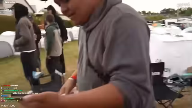 07:53:20Ein weiterer thematischer Schwerpunkt ist das gemeinsame Grillen auf dem Campinggelände. Dabei werden sowohl praktische Aspekte wie das Finden von Grillanzündern und die Zubereitung von Essen behandelt, als auch die Interaktion mit anderen Campern. Der Streamer beschreibt eine entspannte und respektvolle Atmosphäre zwischen den unterschiedlichen Festivalbesuchern. Die gemeinsamen Aktivitäten wie Grillen stärken den Gruppenzusammenhalt und bieten willkommene Abwechslung von den intensiven Festivalaktivitäten.