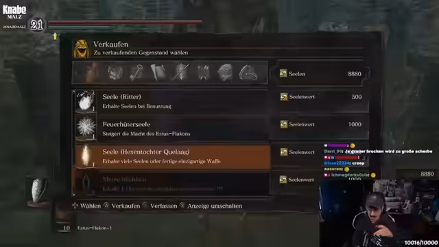 03:06:00Es wird festgestellt, dass die Waffe nicht weiter verbessert werden kann, da eine große Scherbe fehlt, um sie von Stufe 9 auf 10 zu bringen. Der Streamer überlegt, woher er die großen Scherben bekommen kann und ob er sie in Takeshi's Castle kaufen kann. Er erinnert sich daran, dass Frampt da ist und man bei ihm tauschen kann. Es wird überprüft, ob Frampt bereits da ist und es wird bestätigt, dass er nach den beiden Glocken da ist. Der Streamer kann Frauenseelen bei ihm verkaufen, da er diese mag. Es wird festgestellt, dass Frampt keinen Trade für große Scherben hat. Es wird erwähnt, dass weibliche Boseelen bei ihm mehr wert sind als beim Konsumieren. Der Streamer gibt die Feuerhüterinnenseele ab und erhöht seine Estus-Flakons auf plus zwei. Es wird überlegt, wie der Trade bei Hennos Nest ist und ob es sich lohnt, dorthin zu gehen. Der ganze Sinn ist, mehr Schaden zu haben, bevor es nach Anolondo geht.
