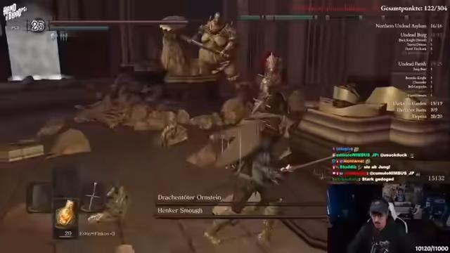 02:12:47Nachdem die Tiefen erkundet und die Glut geholt wurde, befindet sich die Gruppe nun in Blightown. Es wird überprüft, ob die Waffe auf plus 10 gebracht werden kann, was jedoch aufgrund fehlender großer Scherben nicht möglich ist. Der Streamer blendet das Overlay aus, da es sich um einen normalen No-Death-Run handelt, bei dem es nicht um Punkte geht, sondern um den In-Game-Progress. Es wird überlegt, ob der alte Drache besiegt werden soll, um Seelen zu erhalten. Ab dem 28. April werden die Teilnehmer auf Twitch ihre Dark Souls 2 Runs starten, wobei die Soulkeepers-Seite als Plattform dient. Es wird diskutiert, ob der Boss im Asylum benötigt wird, da er viele Seelen bringt, aber der Streamer möchte alle Bosse besiegen, um seine persönliche Traumabewältigung zu unterstützen und alle Black Knights zu erledigen.