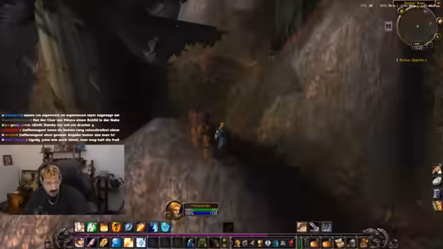00:47:56Nach Login-Problemen lädt der Streamer Alquaria mit dem Charakternamen 'Tamum Bombe' in seine Gruppe ein. Es folgt ein Austausch über Ausrüstung: Er bietet ihr seine 'Novizenrobe' an, die er ihr schenken möchte, was zu einer humorvollen Diskussion über deren Aussehen (tiefen Ausschnitt) führt. Alquaria nimmt das Angebot an und erhält die Robe, was die gegenseitige Unterstützung im Spiel zeigt.