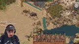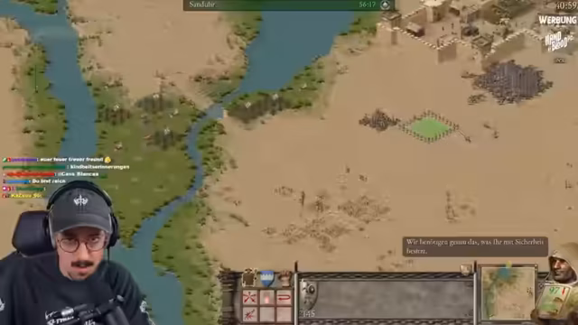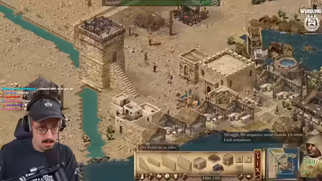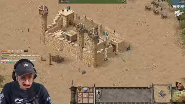 04:29:35Die Mission 'Der Zorn in der Wüste' startet mit dem Bau eines Kornspeichers, drei Häusern und einem Söldnerposten. Die Starttruppe wird in Meuchelmörder umgewandelt. Der Streamer experimentiert mit verschiedenen Strategien, wie dem Bau von Forward Towers und der Konzentration auf arabische Bogenschützen, um die nomadischen Feinde zu bekämpfen. Er diskutiert, ob ein frühes Angreifen des Schweinenachbarn vorteilhaft ist oder ob eine defensivere Vorgehensweise besser geeignet ist, um Ressourcen zu sichern und Angriffe abzuwehren.